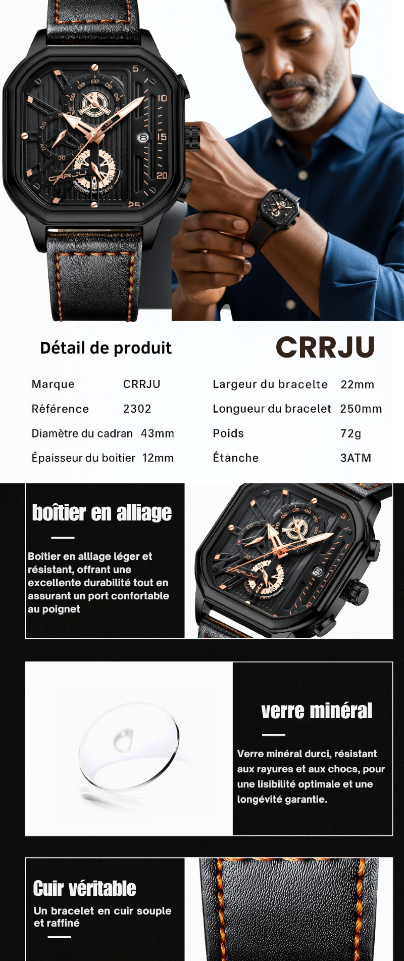 Chaque détail compte : cuir cousu avec soin, boîtier poli, gravure élégante au dos et verre d’une finesse remarquable. Offrez-vous l’excellence au poignet !